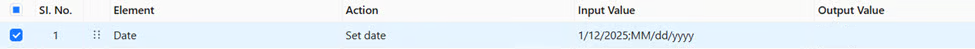 The Set Date action takes the value from the Input Value column (e.g., 1/12/2025;MM/dd/yyyy) and sets the specified date in the captured date field of the desktop application based on the defined format.