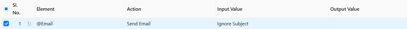 The Send Email action takes the value from the Input Value column (e.g., Ignore Subject) and performs the send operation for the drafted email in Outlook. If no subject is provided, a confirmation pop-up appears. To bypass this pop-up and send the email without a subject, input the value Ignore Subject.