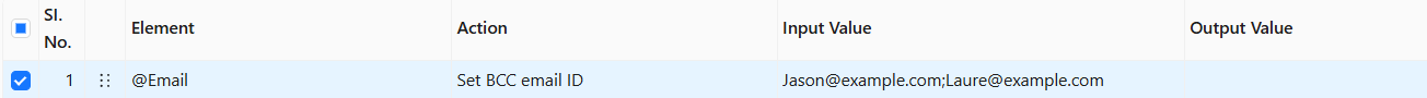 The **Set BCC email ID** action takes the value from the Input Value column (e.g., **<Jason@example.com>;<Laure@example.com>**) enters the provided email addresses into the BCC field of the email.