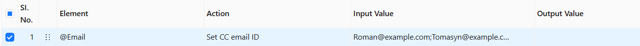 The **Set CC email ID** action takes the value from the **Input Value** column (e.g., **<Roman@example.com>;<Tomasyn@example.com>**) and populates the “CC” (Carbon Copy) field in the Outlook desktop application with the provided list of email addresses.