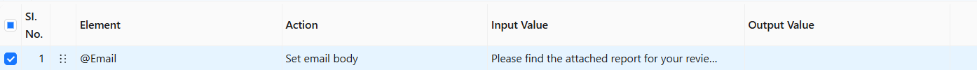 The **Set email body** action takes the value from the Input Value column (e.g., **Please find the attached report for your review and feedback**.) and enters the provided text into the body section of the email.