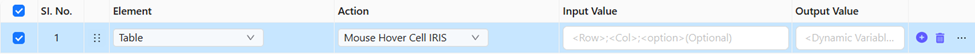 This is prebuilt action in Avo Assure, designed for table elements captured from desktop applications using the IRIS method. It instructs the Avo Assure Client to perform a mouse hover over a specified table cell of an IRIS object and stores the resulting status (True or False) in the output variable.