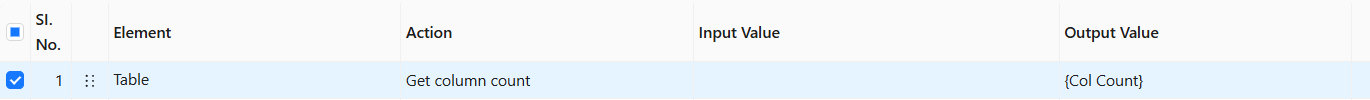 The **Get column count** action does not require any value in the Input Value column. It automatically counts the number of columns present in the captured table element from the application and stores the result in the **{Col Count}** variable as (**5**)