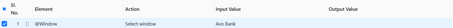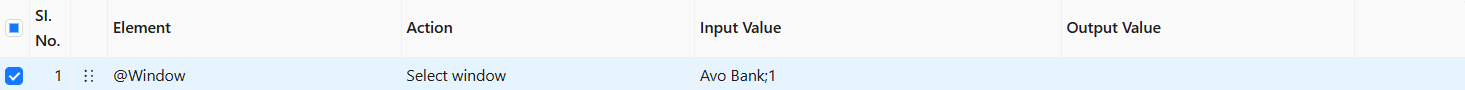The **Select Window** action takes the value from the Input Value column (e.g., **Avo Bank;1**)  to identify and activate the specified desktop window based on its title and index.