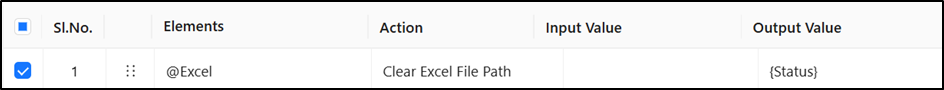 * **Logical Explanation**: The **Clear Excel File Path** action executes without any input value and clears the previously stored file path to avoid conflicts. The result of the action is stored in the **{Status}** variable as true.