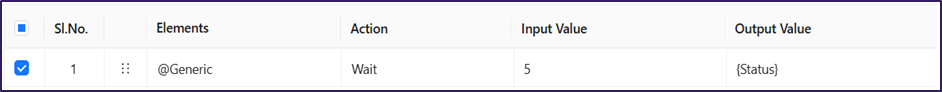 * **Logical Explanation**: The **Wait** action fetches the value from the **Input Value** column (**5**). It pauses the test execution for **5 seconds** and then resumes the next step. After the pause completes, it stores the result as (True) in the **{Status}** variable. This ensures that elements load properly, background processes complete, and the system becomes ready for the next action.