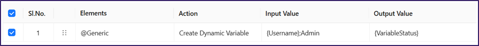 * **Logical Explanation**: The **Create Dynamic Variable** action fetches the value from the **Input Value** column (**{Username};Admin**). It creates a dynamic variable named {Username} and assigns the value (Admin) to it. This variable can be reused throughout the Test Case. The execution result is stored as (True) in the **{VariableStatus}** dynamic variable.