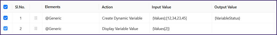 * **Logical Explanation**: The **Create Dynamic Variable** action takes the value from the **Input Value** column (**{Values};\[12,34,23,45]**) and creates a dynamic variable named {Values} containing the array \[12,34,23,45]. Each position in the array can be accessed using array indexing. The **Display Variable Value** action displays the value at the 2<sup>nd</sup> index of the dynamic variable by using **{Values\[2]}** as input and shows the value as (23).