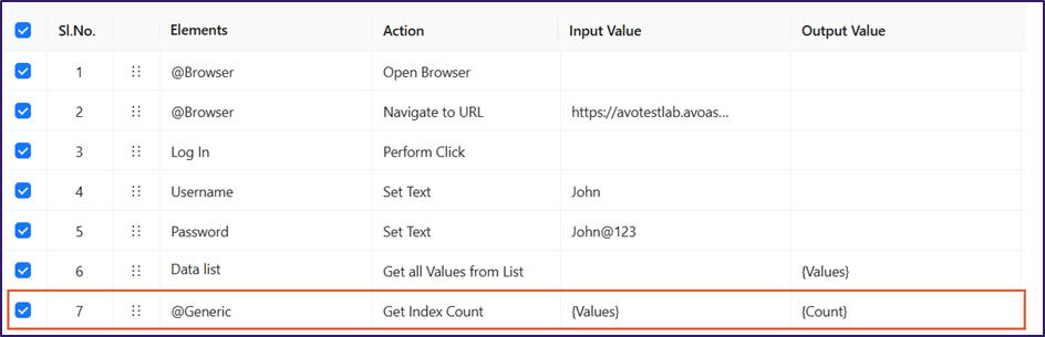 **Note**: Before you use the **Get Index Count** action, make sure a previous step **Get All Values from List** action retrieves the list items and stores them in a dynamic variable. For example: {Values}.