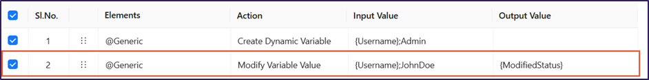 Logical Explanation: The Modify Variable Value action takes the value from the Input Value column ({Username};JohnDoe) and updates the existing dynamic variable {Username} with the new value JohnDoe (Old value is Admin). After the update, the action stores the execution result (True) in the {ModifiedStatus} variable.
