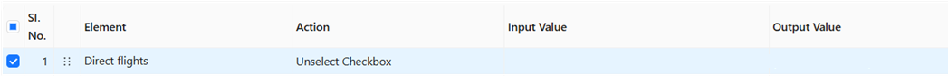 The **Unselect Checkbox** action does not require any input value. It unselects the Direct flights checkbox element during execution.
