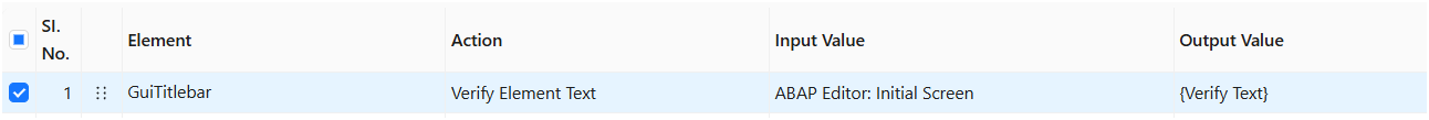 The **Verify Element Text** action takes the value from the Input Value column **(e.g., ABAP Editor: Initial Screen)** and checks whether the visible text of the captured element matches the provided input. The result of the verification is stored in the **{Verify Text}** variable as **True** (if the text matches) or **False** (if the text does not match).