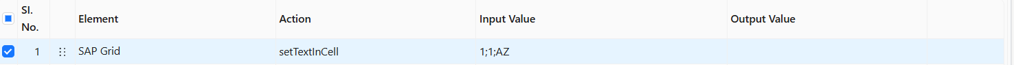 This is a pre-built action available under the **Captured Grid Element** in the **SAP GUI Application**. The functionality of this action in Assure is used to enter or set text in a specific cell of the grid based on the input row, column and text provided.