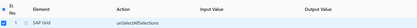 The **UnselectAllSelections** action removes all current row selections in the SAP Grid. This action does not require any value from the Input Value column.
