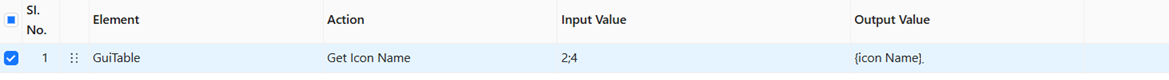 The **Get Icon Name** action takes the value from the Input Value column **(e.g., 2;4)** and fetches the name of the icon from **(e.g., S\_LEDG)** the respective cell in the SAP GUI table. The result of this retrieval is stored in the **{icon Name}** variable.