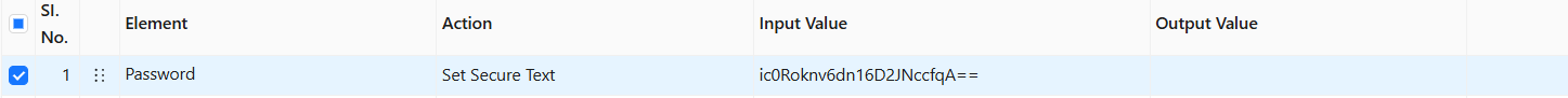 The **Set Secure Text** action takes the value from the Input Value column **(e.g., ic0Roknv6dn16D2JNccfqA==)** and securely enters the provided encrypted text into the Password textbox element.