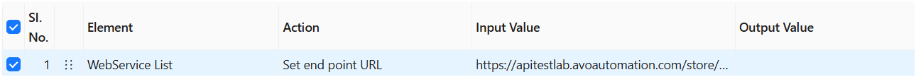 The **Set end point URL** action takes the URL from the Input Value column **(e.g.,** [**https://apitestlab.avoautomation.com/store/api/carts/**](https://apitestlab.avoautomation.com/store/api/carts/)**)** and configures the web service request to target this endpoint.