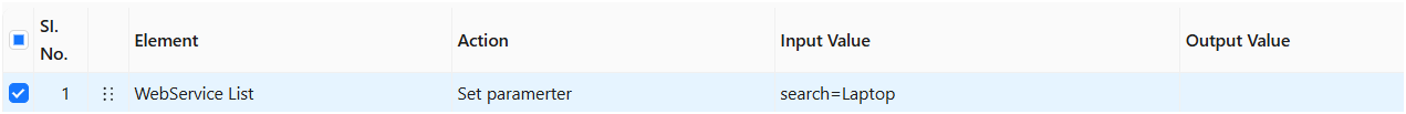 The **Set parameter** action takes the value from the Input Value column **(e.g., search=Laptop)** and sets the specified parameter for the WebService request. This can be used for query parameters or request body parameters, depending on the API structure.