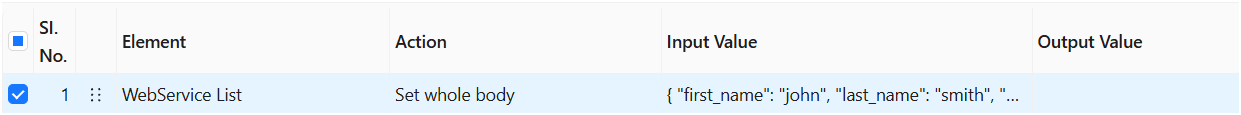 The **Set whole body** action takes the value from the Input Value column and sets the entire body content for the web service request.