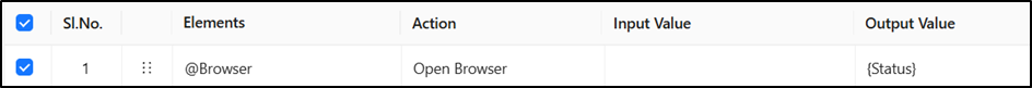 * **Logical Explanation**: The **Open Browser** action executes without requiring any input value. It launches the web browser chosen at the time of debugging or execution. The execution result is stored in the **{Status}** variable as true.