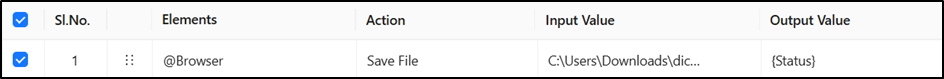 * **Logical Explanation**: The **Save File** action takes the value from the **Input Value** column (**C:\Users\Downloads\dictionary.pdf;2**) and saves the file currently open in the browser to the specified path. The optional wait time allows for a short delay before performing the save. After execution, the result of this operation is stored in the **{Status}** variable as true.