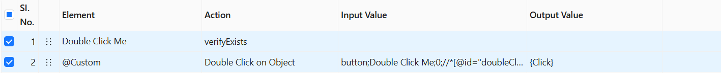 The Double Click on Object action takes the value from the Input Value column (e.g., button;Double Click Me;0;//*[@id="doubleClickBtn"]) and performs a click operation on the matching object based on the object type, visible text, index and abs. The result of the click operation is stored in the {Click} variable as True or False.