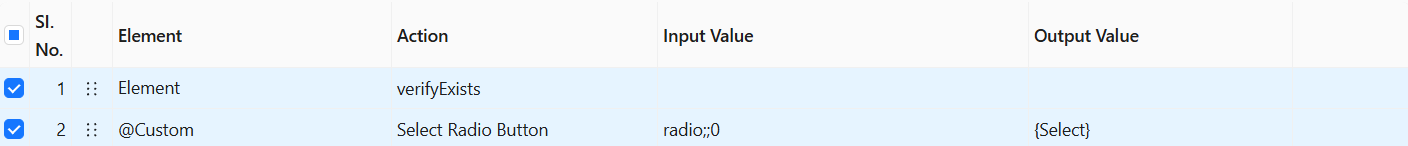 This pre-built Action is located under the **@Custom Element.** The functionality of this action in Avo Assure to select the radio button which is specified in the input, and save the result in dynamic variable.