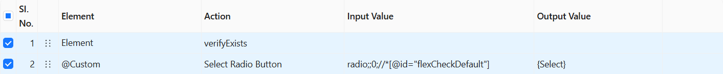 The **Select Radio Button** action takes the value from the Input Value column (e.g., **radio;;0;//\*\[@id="flexCheckDefault"]**) and selects the specified radio button based on the given index. The result of the selection operation is stored in the **{Select}** variable as **True** or **False**