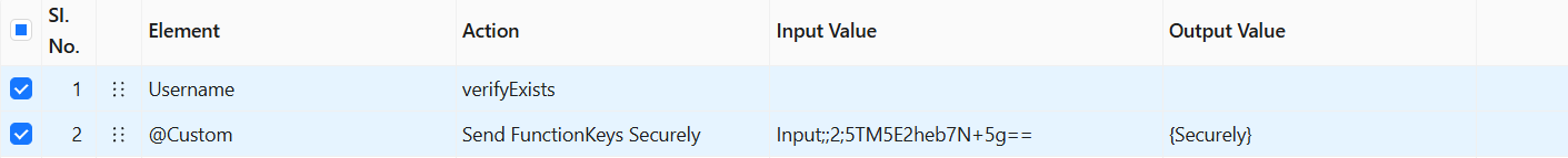 This is a pre-built Action located under the **Custom element.**&#x54;he functionality of this action in Avo Assure to accept an encrypted text and send the individual keystrokes to the textbox specified in the input value, and save the result in dynamic variable.