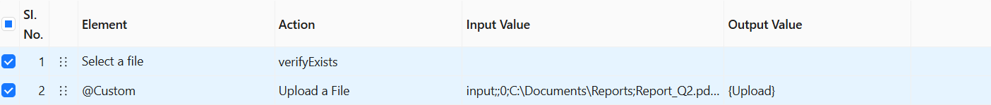 The Upload a File action takes the value from the Input Value column (e.g., input;;0;C:\Documents\Reports;Report_Q2.pdf;3) and uploads the given file after the specified wait time. The result of the file upload operation is stored in the {Upload} variable, with the following possible values: