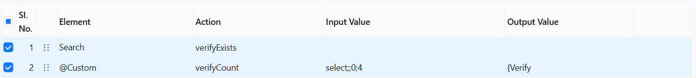 The **Verify Count** action takes the value from the Input Value column (e.g., **select;;0;4**) and verifies whether the number of items in the specified object matches the expected count. The result of the verification is stored in the **{Verify}** variable, with the following possible values: