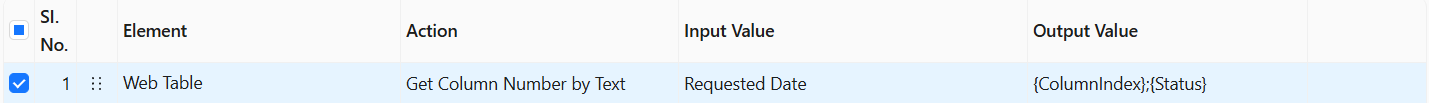 The Get Column Number by Text action takes the value from the Input Value column (e.g., Requested Date) and identifies the corresponding column index by searching the column header text in the table. The resulting index is stored in the {ColumnIndex} variable and the execution status is saved in the {Status} variable with the following possible values: