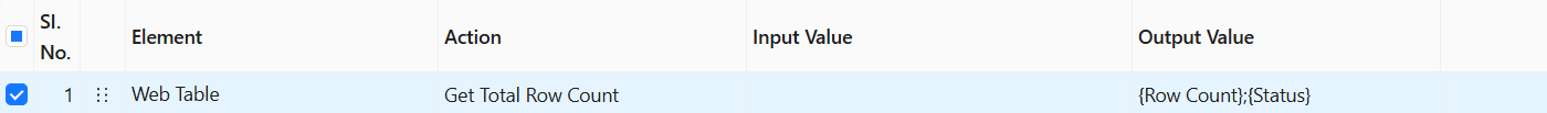 The **Get Total Row Count** action does not require any input value. It analyzes the captured table structure and retrieves the total number of rows are present in the table. The total row count is stored in the **{RowCount}** variable and the execution status is saved in the **{Status}** variable with the following possible values: