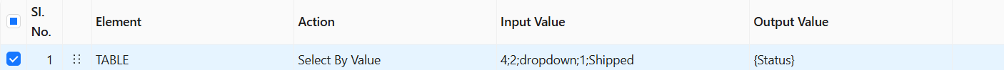 The **Select by Value** action takes the input from the Input Value column (e.g., **4;2;dropdown;1;Shipped**) and selects the matching value from the dropdown element located in the given table cell. The result is stored in the **{Status}** variable, with possible values: