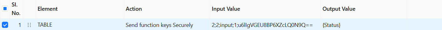 The **Send Function Keys Securely** action takes the input from the Input Value column (e.g., **2;5;input;1;u6llVGDU88P6XZcLQ0n9Q==**) and sends the decrypted keystroke value to the textbox located in the given cell. The result is stored in the **{Status}** variable, with possible values: