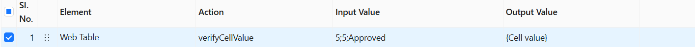 This is a pre-built Action located under the Table captured from the AUT Element, instructs the Avo Assure to verify the value of the specified table cell in the input value of Avo Assure and save the result in the given dynamic variable.