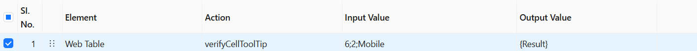 The Verify Cell ToolTip action checks if the tooltip of the table cell (e.g., 6;2;Mobile) contains the given value. If the tooltip text matches, the result is stored in the {result} variable with the following possible values: