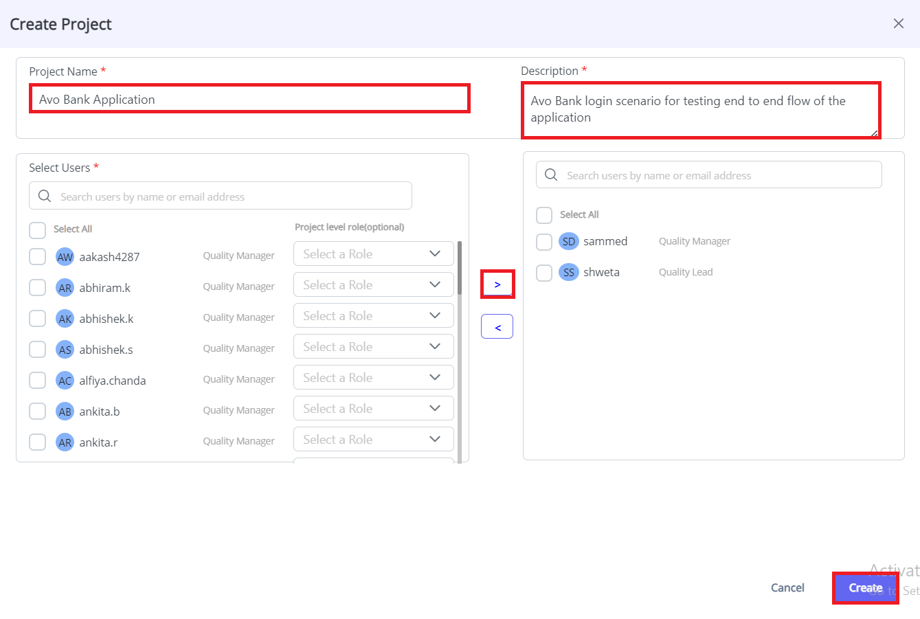 2. Enter Project Name, enter Description of project, select Users from the left-hand column and assign them role from Project level role drop down. Then click (>) arrow icon to assign user to project and click Create button it will create new project and displayed on landing page