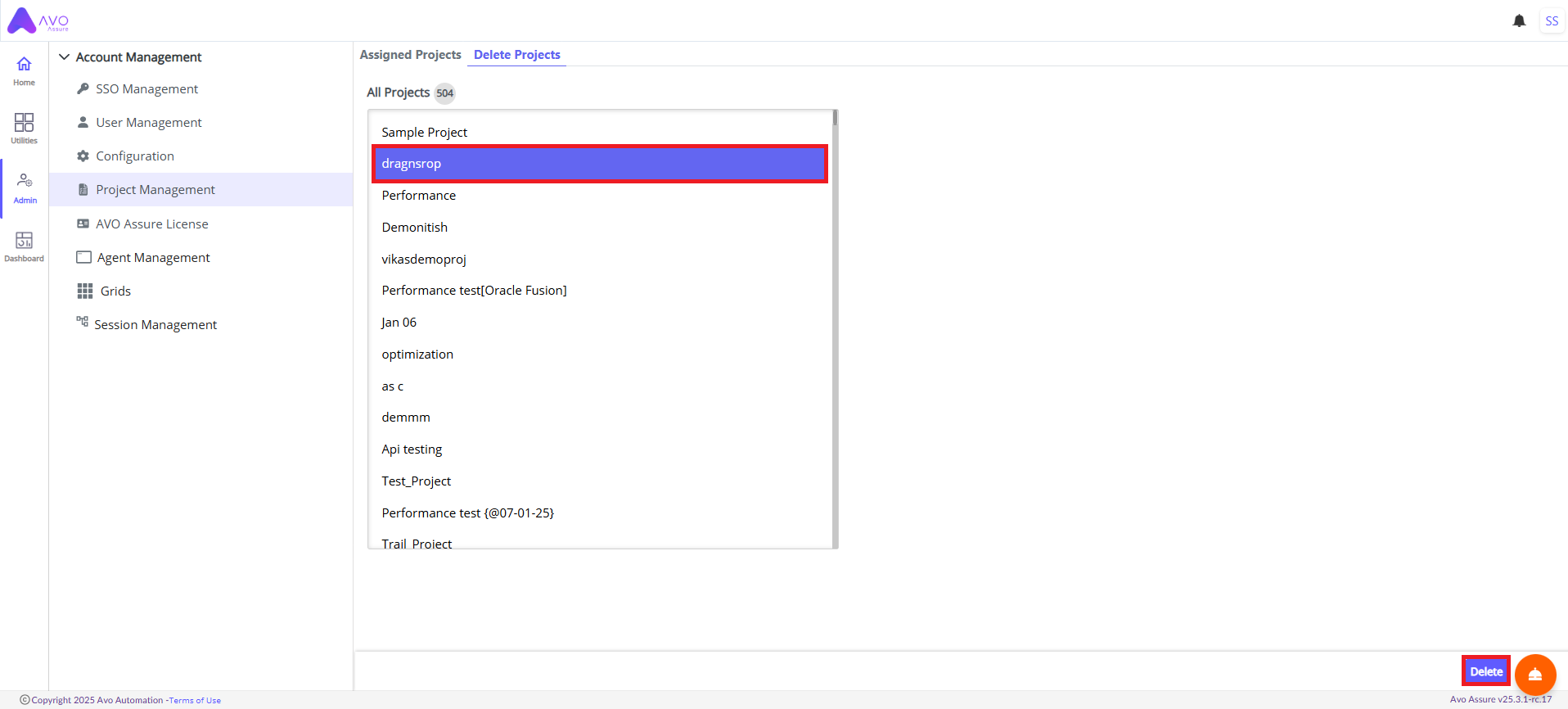 2. Click **Delete Projects** tab