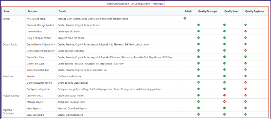 2. Select the **Privileges** tab to view the user roles and their permissions.