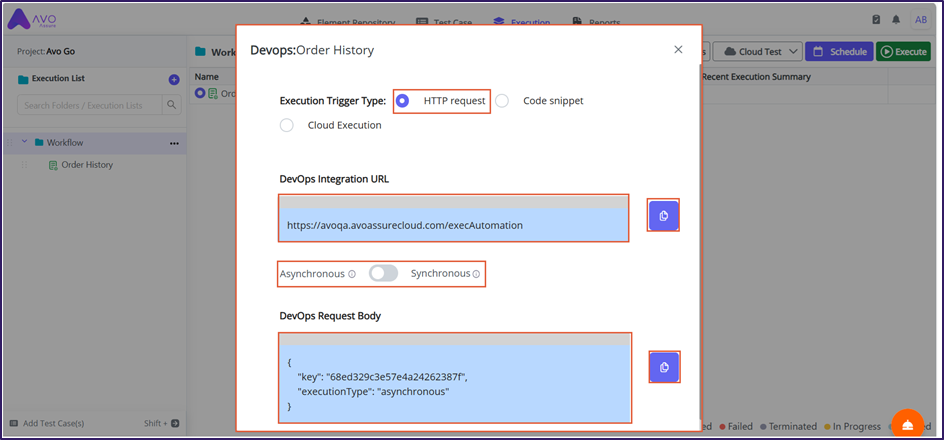 2. Select **Cloud Execution** and **copy** the code snippet containing the execution list details.