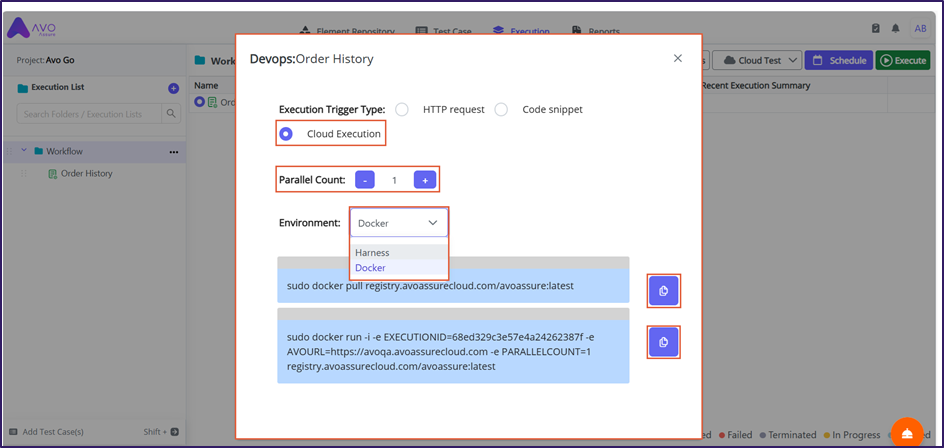 Cloud Execution supports running automated tests in cloud-based environments rather than on local machines. In Avo Assure, Cloud Execution currently supports **Harness** and **Docker** as execution triggers. It enables scalability, cross-browser/device testing, and reduces dependency on local infrastructure.