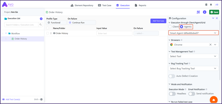 To execute the execution through agent/grid, perform the following actions: