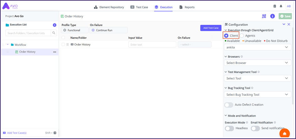 To execute the execution through client, perform the following actions:&#x20;