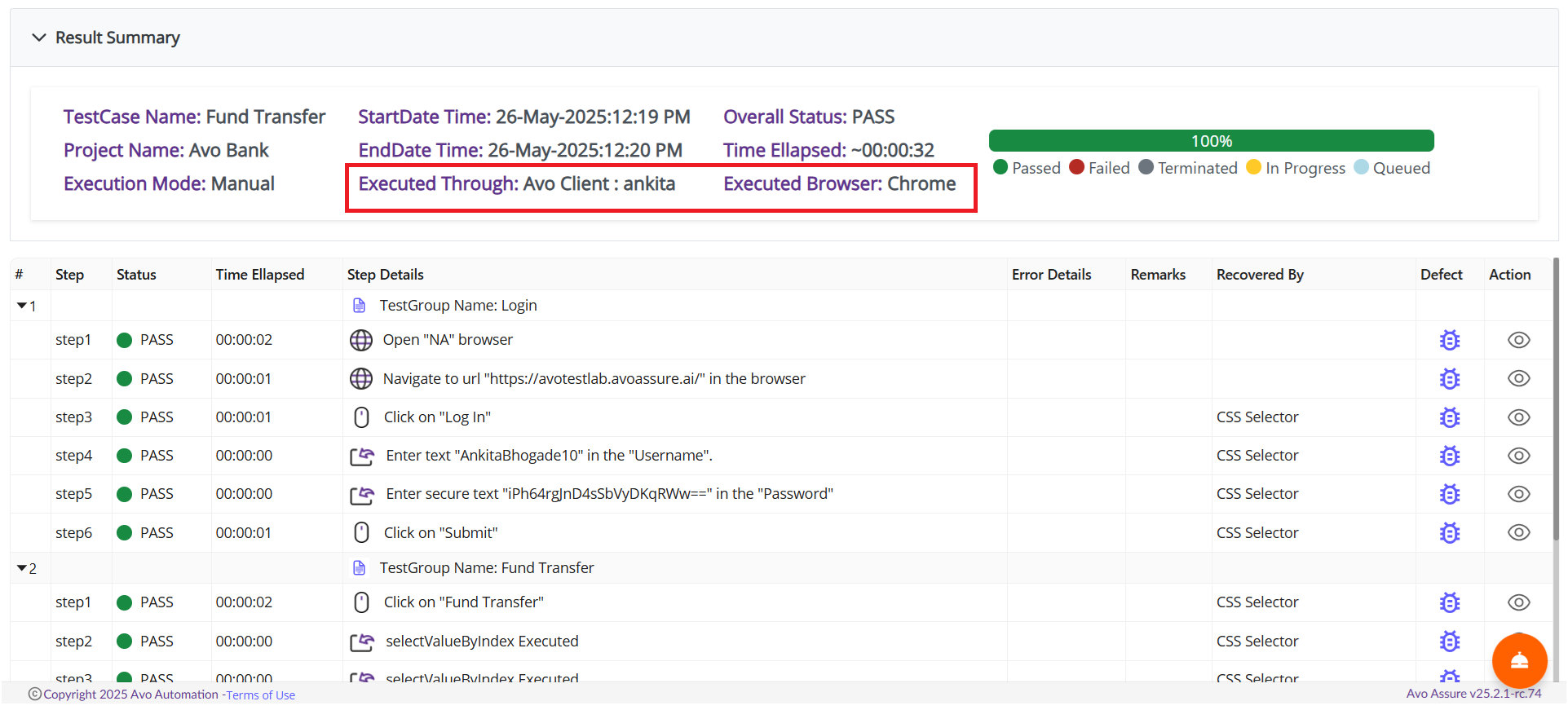 There are three detailed report download options available in Avo Assure – Json, PDF and PDF with screenshot formats.