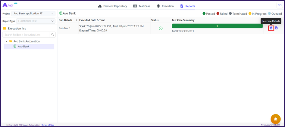 1. Navigate back to the Report tab and click Testcase Details icon, to bring up Run details popup window in top right corner of Reports tab.